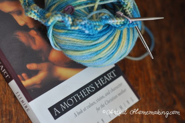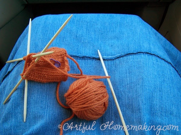 And now I’m starting on a little vest for him, with the yarn my mom gave me. So far it isn’t turning out very successfully, as I’ve lost my place and messed up three times and ripped it out and started over three times! Most of my knitting takes place in the van while my husband is driving, or at night when we’re watching a video. I might have to get this vest going at night after the children are in bed, when I have more ability to concentrate. 🙂