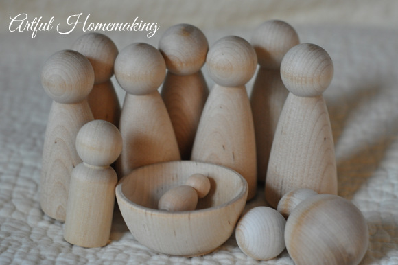 You can also check out this My First Nativity Set which include the unpainted peg dolls for Mary, Joseph, and baby Jesus, and a manger.