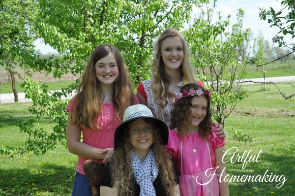 Almost everyone dressed up, and it was fun to see so many little princesses! Our lovely hostess wore a gorgeous dress she found at a thrift store. I just kept admiring the beauty of it–as a little girl, this would have been my dream dress-up dress (actually, I’d still love to wear it)!