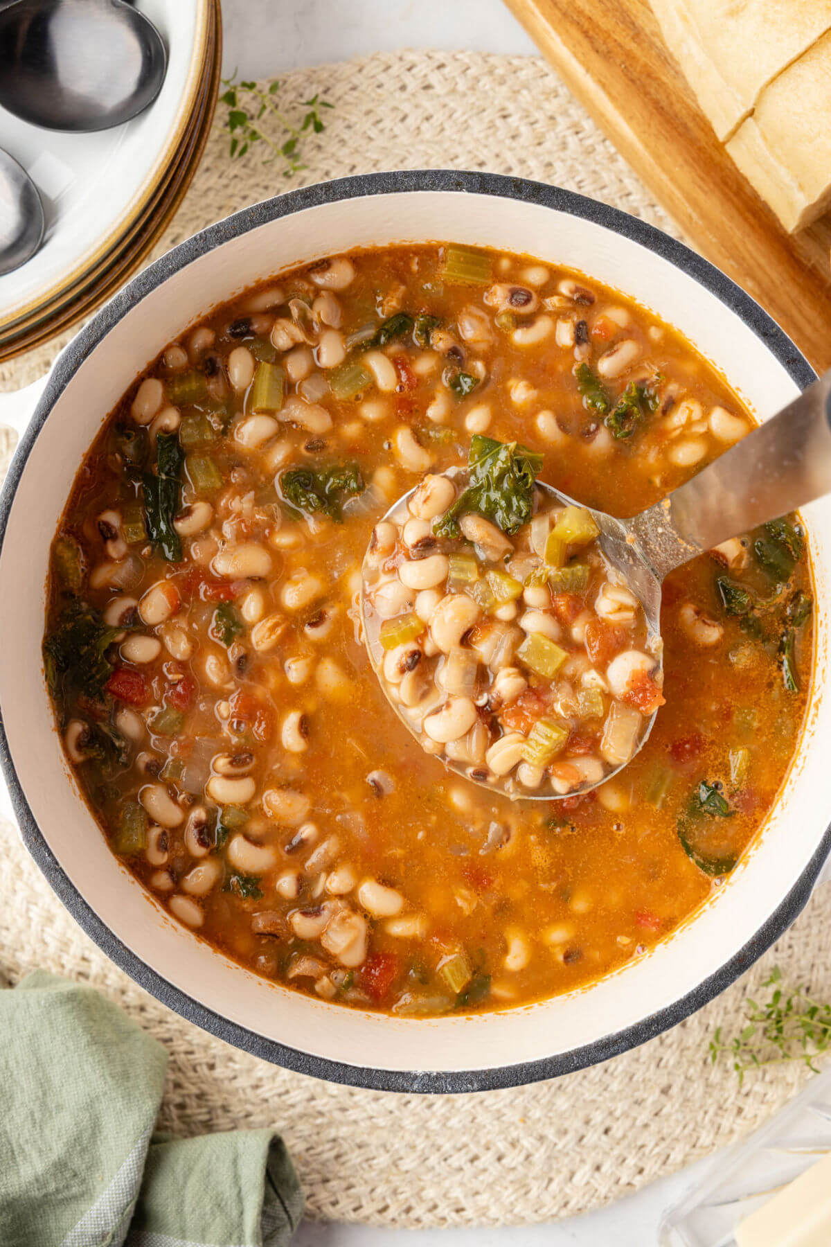 If you would like to make your soup creamy, you can add a half block of room-temperature cream cheese or heavy whipping cream in the last 5 to 10 minutes of cooking. You can also blend 1/4 cup of the black-eyed peas and add them back in as well.