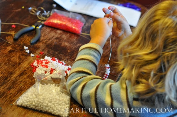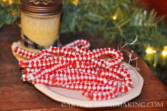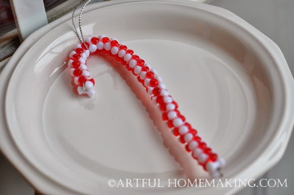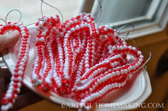 And the beaded candy canes were from a kit I got at Hobby Lobby. I've wanted to make those for years, so I was thrilled to find the kit. We made lots so we could give some away.