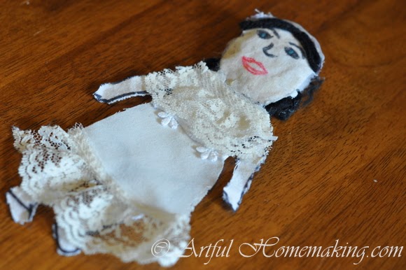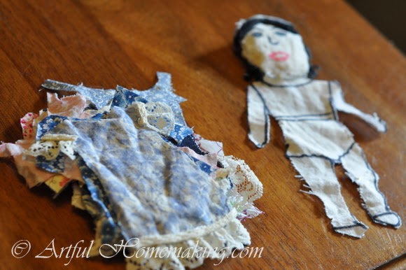 ::.A little cloth lady, designed and created by my creative daughter. She used fabric scraps and leftover bits of lace to make a whole wardrobe of dresses, nightclothes, skirts, and shirts. She may be a dress designer someday.::