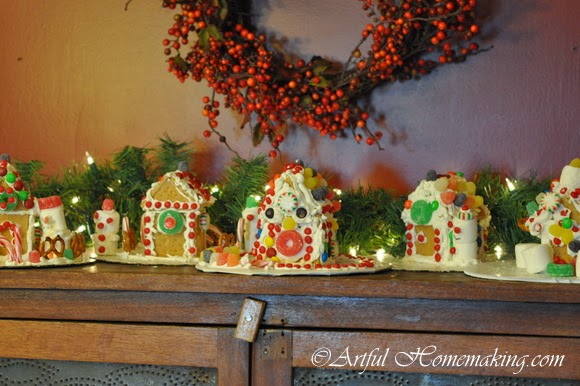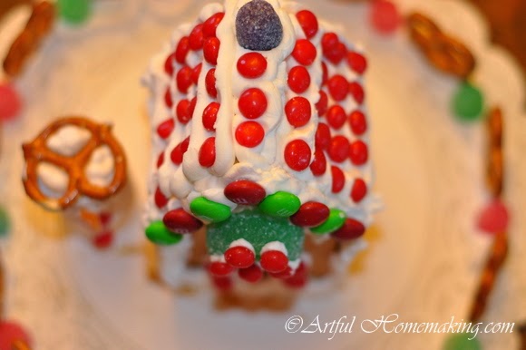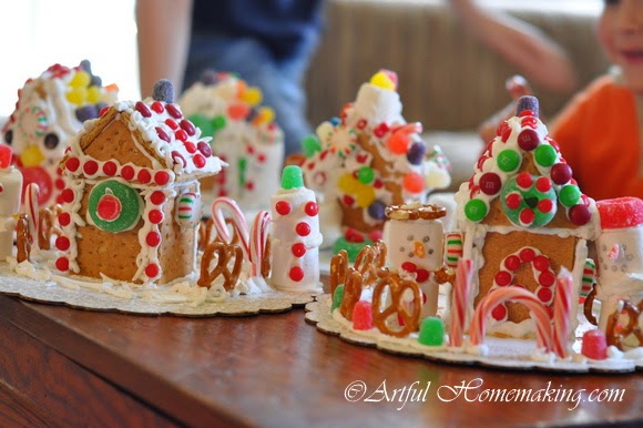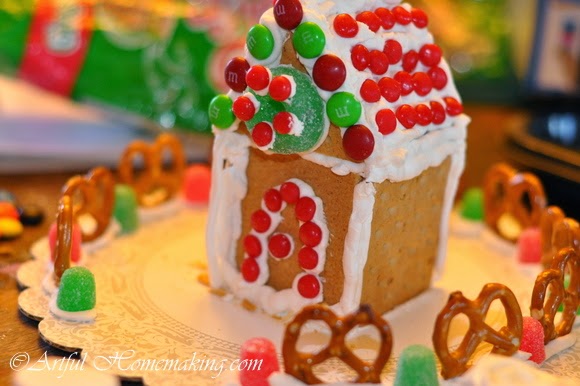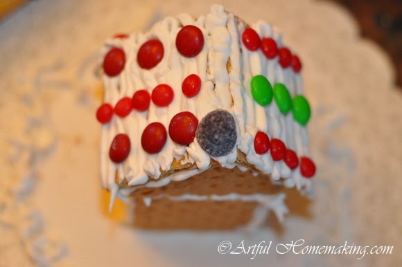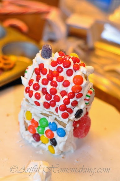 Last week we made simple gingerbread houses, which is a family tradition I started when our children were all very young. We use graham crackers, because it’s easier and they still turn out cute. I was happy this year to find most of the candy at the discount grocery store for very cheap.