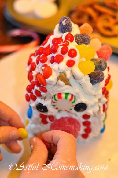 Those are adorable! My sister is in the middle of making a great big graham cracker house and light house and is having a wonderful time too. 🙂 I love the little snowman one of your children made! 🙂