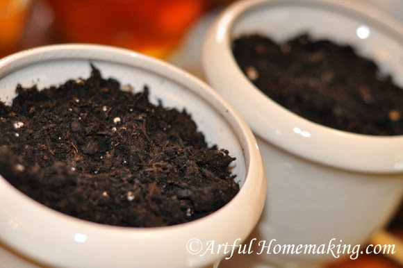 Then very lightly cover with a thin layer of potting soil. Mist or water the top of the soil very well, and then wait for the wheat to sprout!
