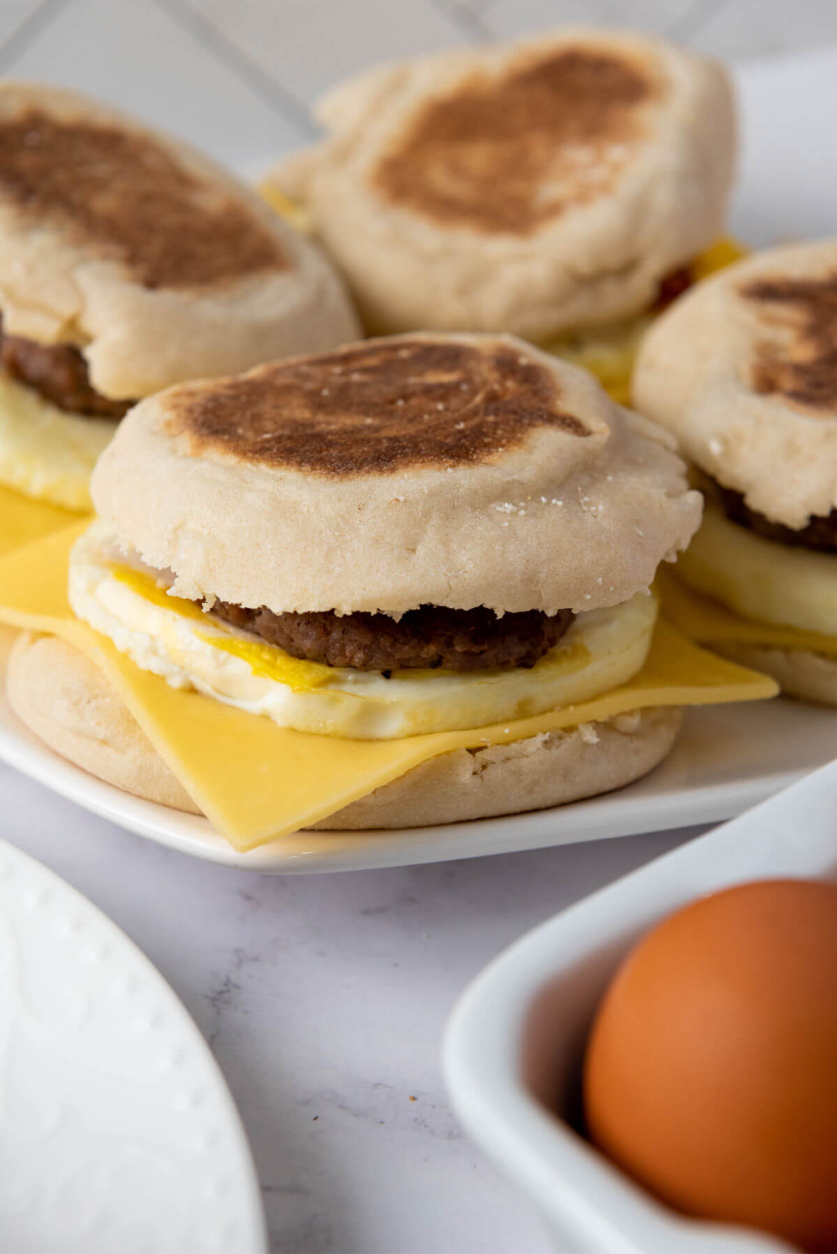 Alternatively, you can wrap the English muffin sandwiches in plastic wrap and then add to a freezer bag, or you can wrap each sandwich with aluminum foil and skip the freezer bag.