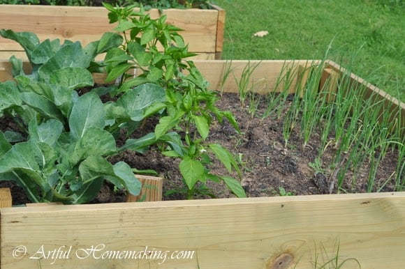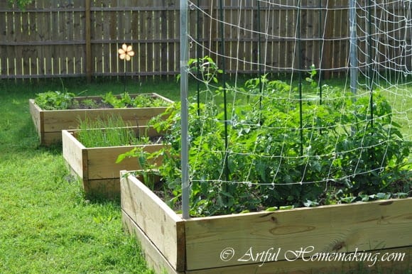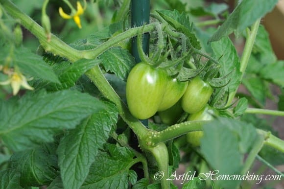 Our raised beds are starting to produce. My mom gave us a bunch of tomato plants that she had started from seed. They were so big and healthy, and there are several different varieties.