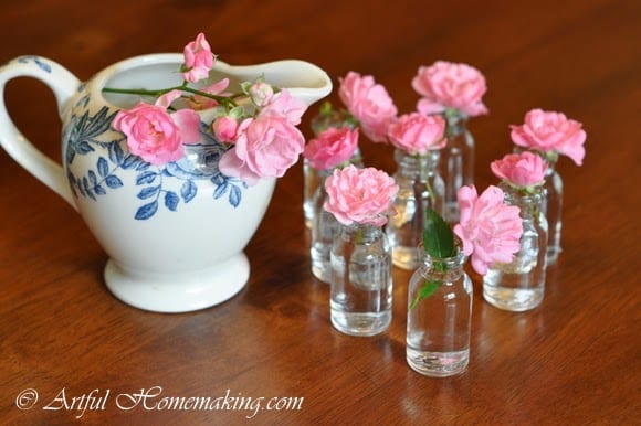 My fairy rose has made a lovely comeback, and I was able to use some of the tiny blossoms for our Mother’s Day table (my dear mother came to church with us, and then we had her over for lunch). I found these tiny little glass bottles at a flea market last year. I only paid about $2.00 for all eight of them. When I saw them, I immediately envisioned little individual bouquets on the table, at each place setting.