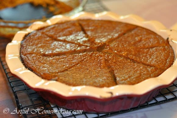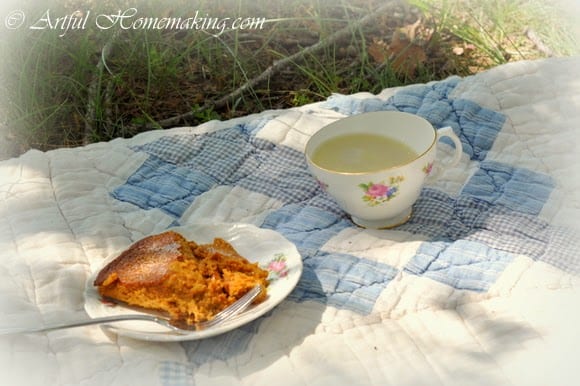 (A crustless pumpkin pie, created by my daughters for our tea party.)