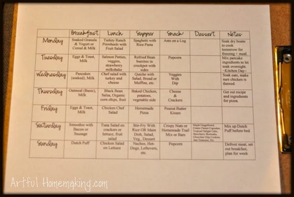 A month or so ago I made a weekly menu plan that stays the same, week after week. I haven’t been able to do it completely yet (as we had other food that needed to be eaten or we were just needing a different plan for that week), but it’s nice to have everything all planned out.