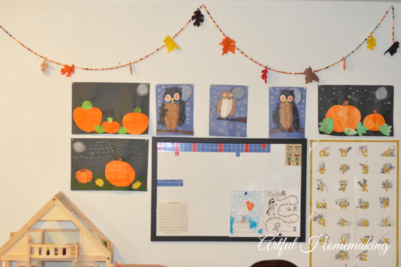 We are all loving the school room we made in our basement a few months ago. It is so nice to have a central place for all the school things. I especially like that we have a place to display art projects after we finish them.