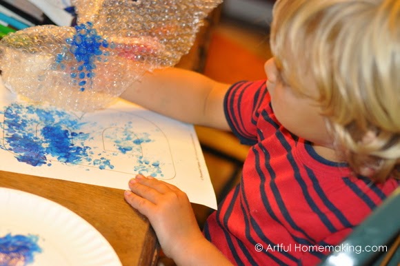 I also decided to incorporate the letter “B” theme into the study, so we talked about the beginning sound in “boat,” and we made this bubble-wrap-printed “