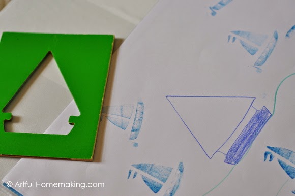 Right before starting the book, I remembered that my mother-in-law had given us some sea-themed rubber stamps that included a sailboat, which was just perfect. We had fun making pictures with the stamps and colored pencils.