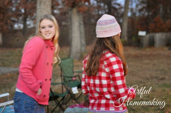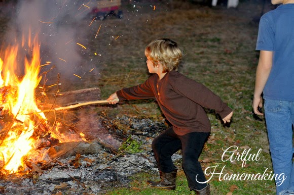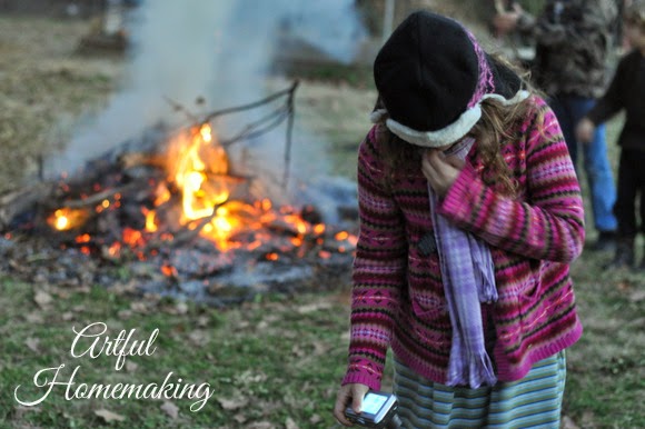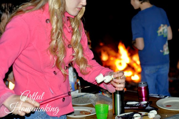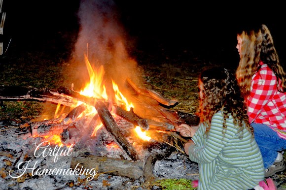 After eating, we sat around the fire telling stories and listening to some owls in the distance. Then my husband brought out the current read-aloud, and read by the fire (using a flashlight for more light).