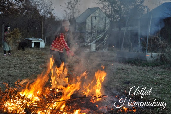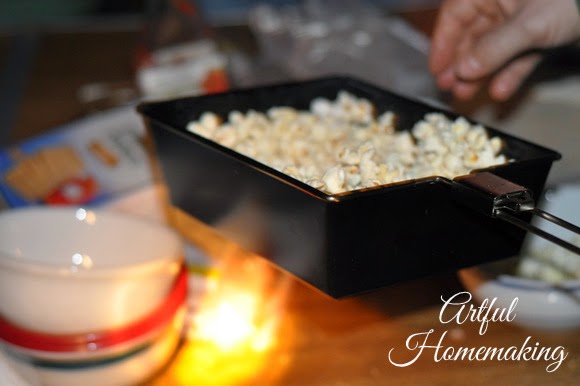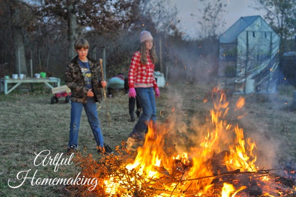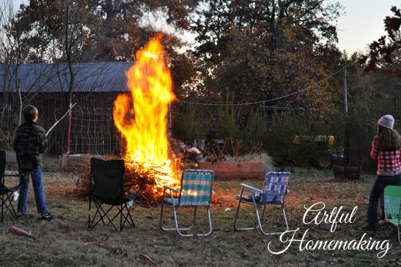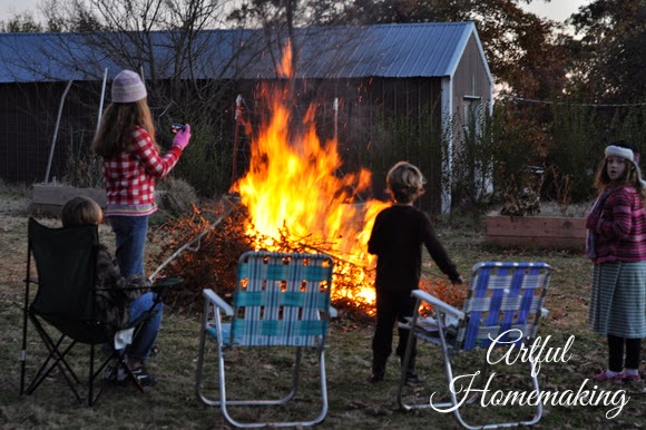 We had a large brush pile that needed to be burned, and our children begged us to make a bonfire. So, on a cold November evening, with a large harvest moon rising in the sky, my husband set out to grant their request. It turned out to be a sweet time of family fellowship, complete with roasting hot dogs and marshmallows, making s’mores, and then popping popcorn over the fire.