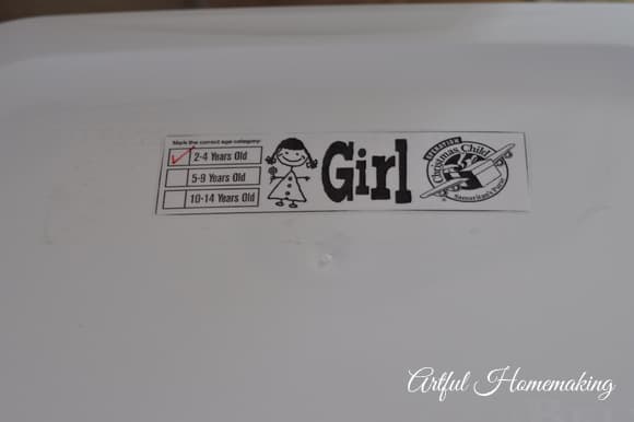 7. Be sure to label your box. Tape a label to the top of each box (I found some labels here), being sure to mark the correct age the contents are intended for (if you make a shipping donation online, you won’t really need this label since you’ll receive another one to print off with the tracking information):