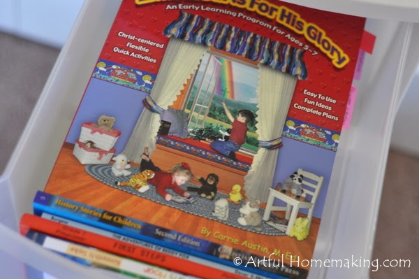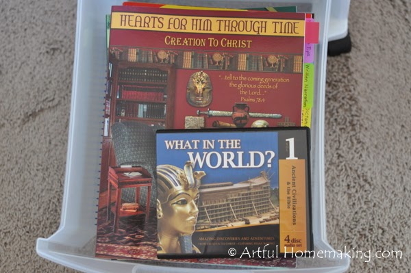 All the additional books that we’ll be using for HOD are stored in these three plastic bins that I had sitting empty in the garage, just waiting to be repurposed. They are stored in a corner in the closet. I keep the current read-alouds and other books that we’re currently using in the rolling cart, and then the rest are stored here. I will look ahead in the guides, and as I see that we need different books, I’ll get them out and put the others away.