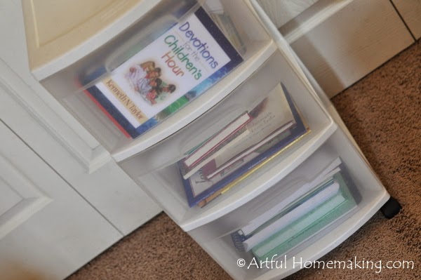 The cart has three drawers, and all of the books fit just perfectly! In the top drawer, I have the LHFHG books and also the math books and materials we’ll be using.