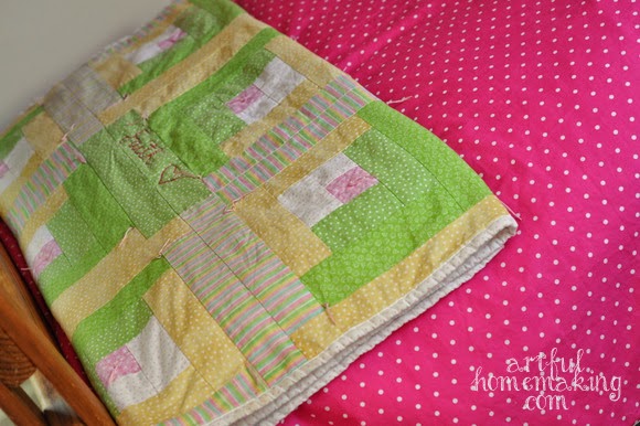And here is Faith’s log cabin quilt that I finished earlier this year. It doesn’t match the room exactly, but it’s close enough, and she loves it!