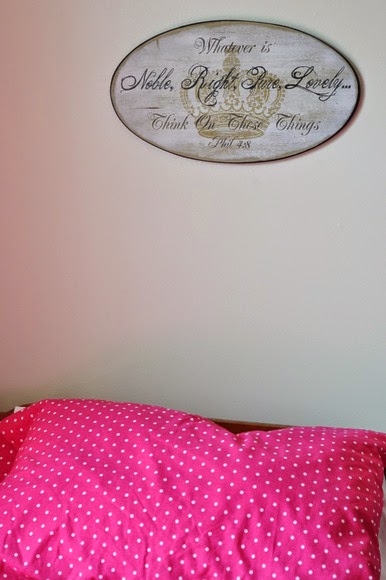I love this reminder from Philippians 4:8, which hangs over Elyse’s bed. We found this at Hobby Lobby’s half-off sale about three years ago.