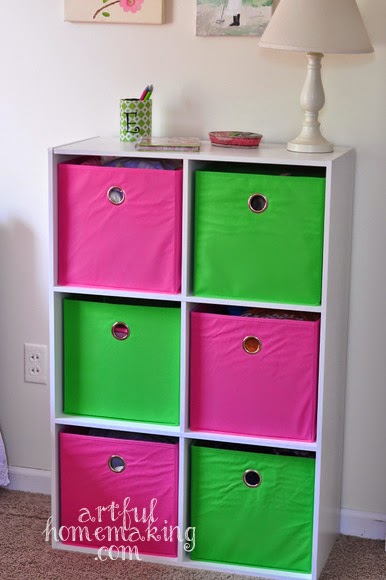 Our oldest daughter sleeps in this twin bed, which was her daddy’s when he was a boy. Instead of a dresser, each girl has her own little cube thing with fabric drawers to store her clothes in. We have a local store that regularly has these 50% off (and we also used a coupon to make the deal even better). This was what Elyse wanted for her birthday, to replace the large brown dresser that used to be by her bed. It took up a lot of space and the drawers were broken, so this is a nice, cheerful improvement!