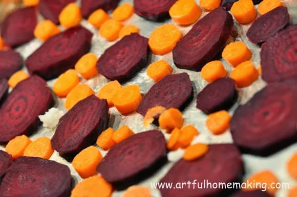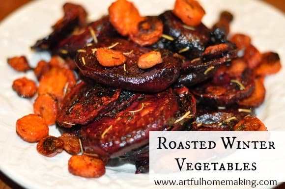 - 6-8 cups winter vegetables, such as potatoes, sweet potatoes, carrots, turnips, parsnips, rutabagas, beets, winter squash (peeled and cut into 1/4″ to 1/2″ slices). This is my favorite source for organic vegetables.