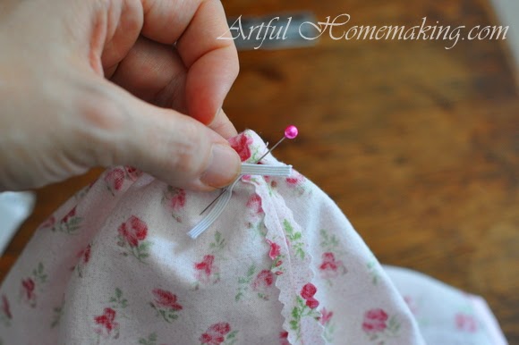 After the elastic is threaded through the casing, pin the two ends of the elastic together, and sew them together. I used the sewing machine for this, but the elastic is so narrow that you may prefer to do it by hand. Either way works fine, you just want to make sure it is securely tacked together.