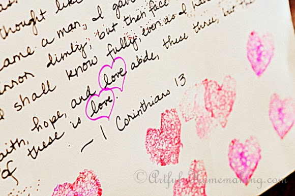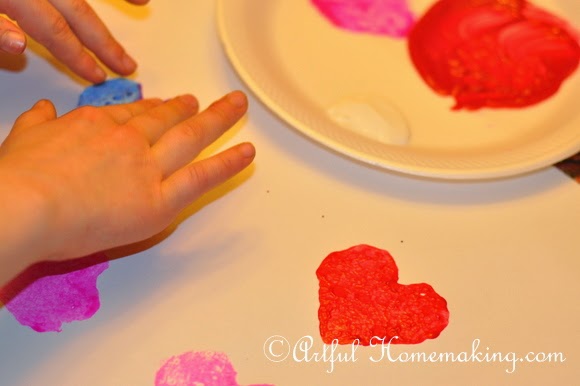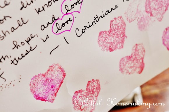 This year, I decided to spend the whole month on the topic. We’re working on memorizing 1 Corinthians 13 (I memorized it years ago, but I wanted my children to have it hidden in their hearts, too.). We made a poster with 1 Corinthians 13 written out on it, and then we decorated it with glitter and sponge-painted hearts. It hangs in the dining room, where we can review it often, and be reminded of what true love really is.
