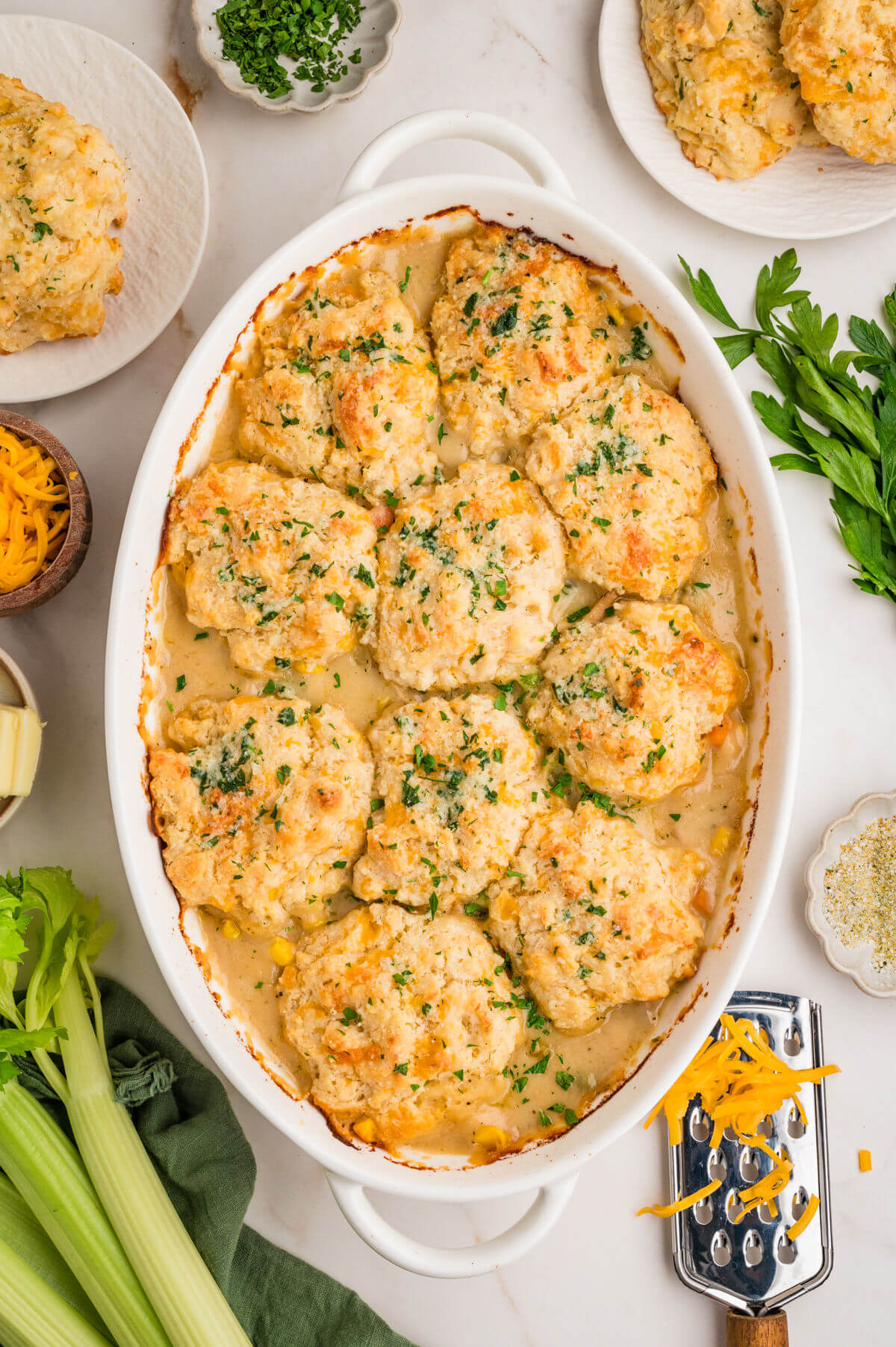 Any large casserole dish or baking dish will do. Just make sure it’s oven-safe and deep enough for the creamy filling and biscuits.