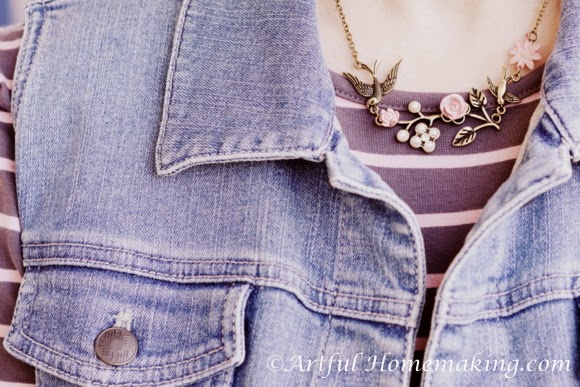 Pink/grey stripe top, denim vest (ebay), grey skirt (thrift store).