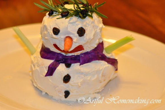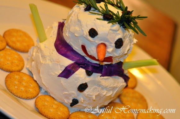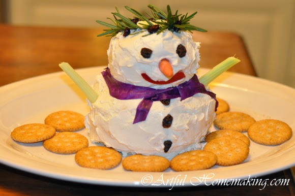 See my cute cheese ball snowman? I found the recipe on Pinterest, and I made him for our belated Christmas program at church (because the whole church came down with colds and/or flu right around Christmas time, we decided to postpone it until after Christmas).